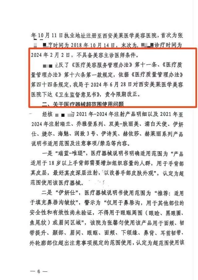 脸颊出现凹陷后,“每次找去,医院都没有解决的意思,还报警说我医闹,有谁花200多万元医闹?”2024年四五月份,张女士向西安市莲湖区卫健局投诉,2024年7月,莲湖区卫健局给出回复,给张女士治疗的18名医生中,11名不具备主诊医师资质,同时,还存在医疗器械超范围使用的情况。张女士说,在美莱医院,“约90万元的针都是医生王某打的,最后打坏这次也是她,她一直没有主诊资质。”