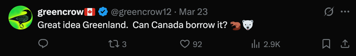 有网友说,“格陵兰岛的主意真不错。加拿大可以借用吗?”↓