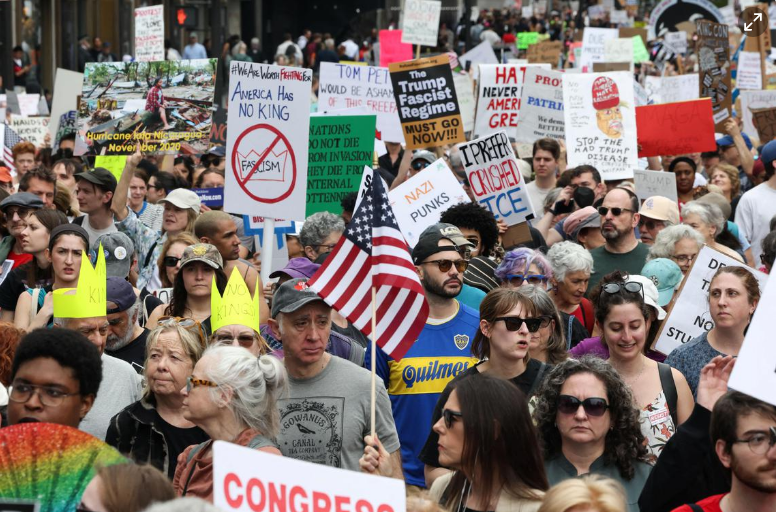 在纽约,人们在市图书馆外集会,高举“美国没有国王”和“抵制暴政”等标语,抗议特朗普。