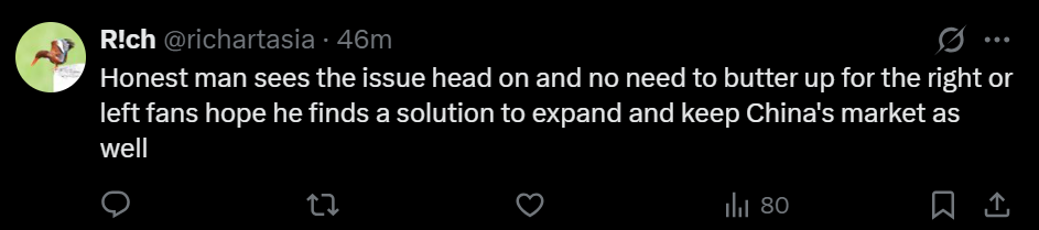 “诚实的人看到了这个问题的正面,没有必要奉承右翼或左翼的粉丝,希望他也能找到一个扩大和保持中国市场的解决方案。” 还有网友认为提出相关问题的记者有些“傲慢”。 来源:环球网