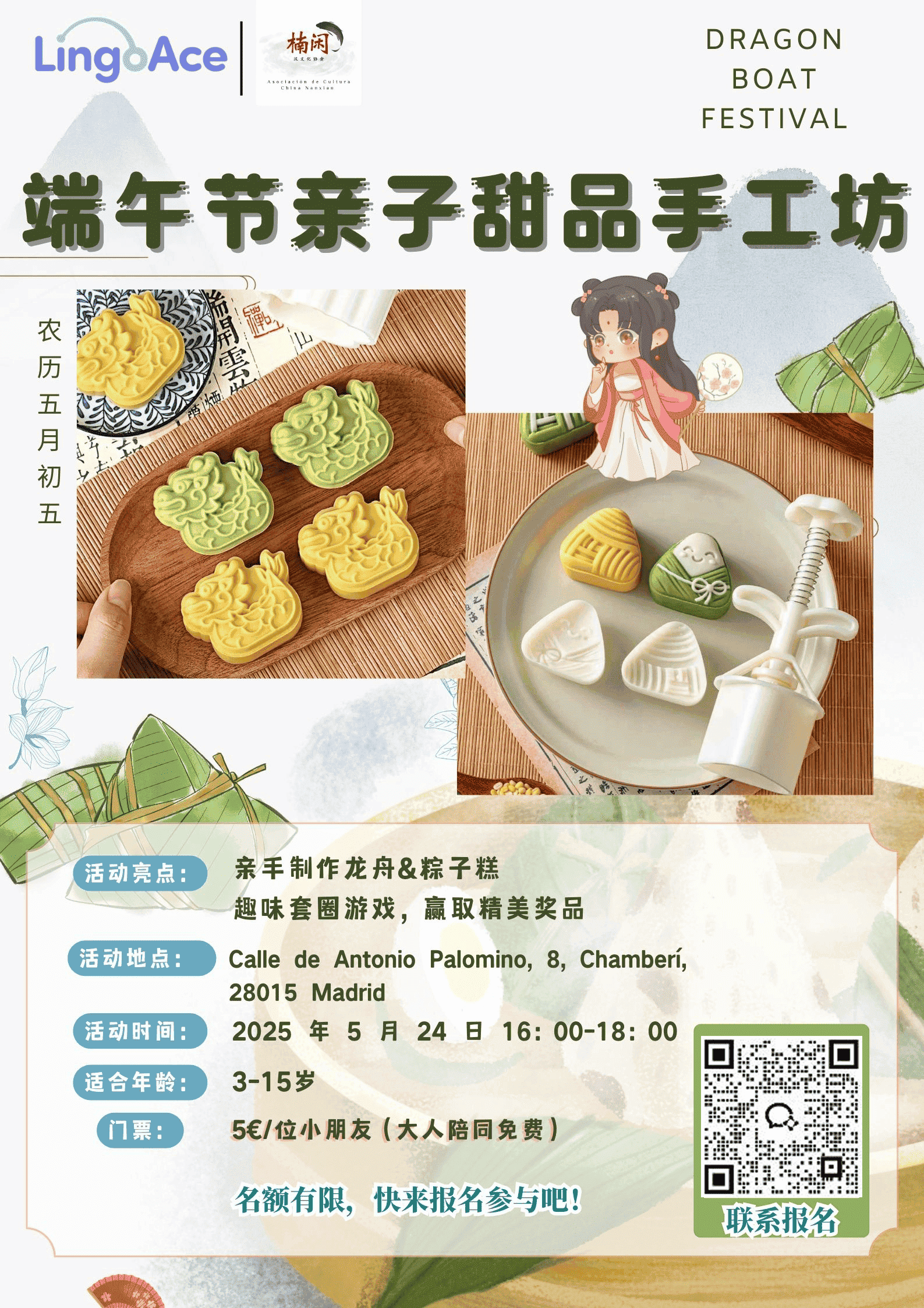 这个端午,在马德里带上宝贝一起体验中国传统文化的魅力!亲手制作龙舟造型甜点和软糯粽子糕,在甜蜜互动中感受节日氛围。还有趣味套圈游戏,赢取精美奖品,收获双倍快乐!