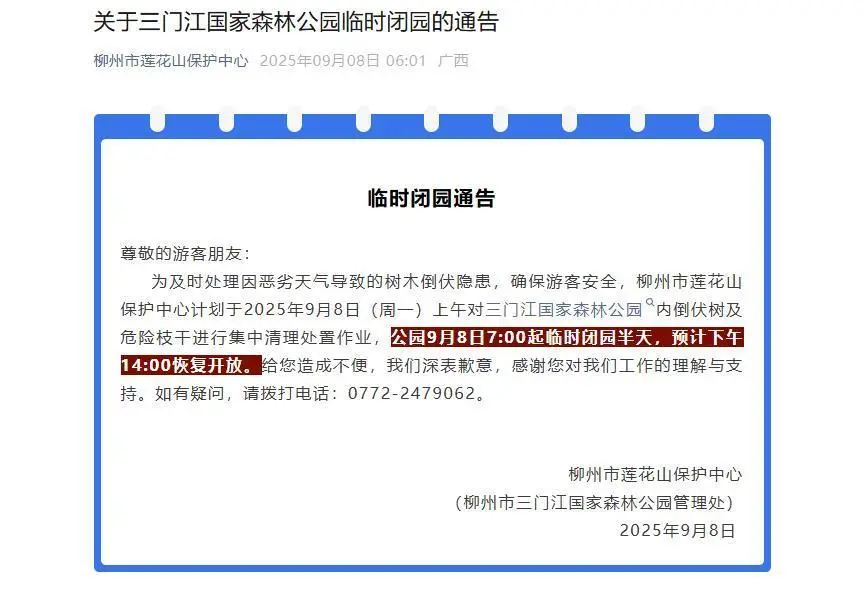 8日6时许,柳州市莲花山保护中心(柳州市三门江国家森林公园管理处)发布临时闭园通告称,为及时处理因恶劣天气导致的树木倒伏隐患,确保游客安全,柳州市莲花山保护中心计划于9月8日(周一)上午对三门江国家森林公园内倒伏树及危险枝干进行集中清理处置作业,公园9月8日7时起临时闭园半天,预计14时恢复开放。