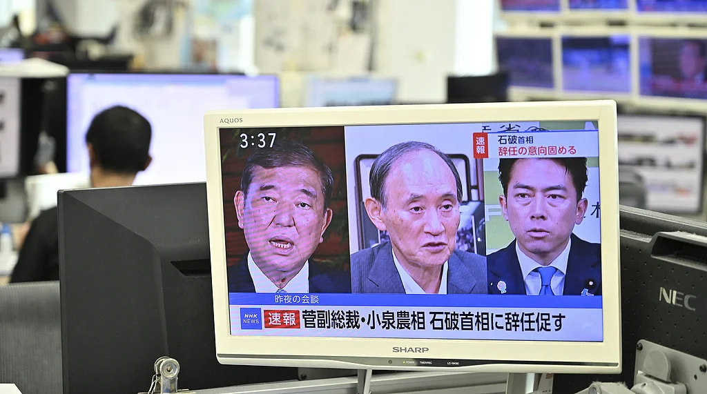 △当地时间2025年9月7日,日本媒体报道石破茂宣布辞职的消息。(图自视觉中国)