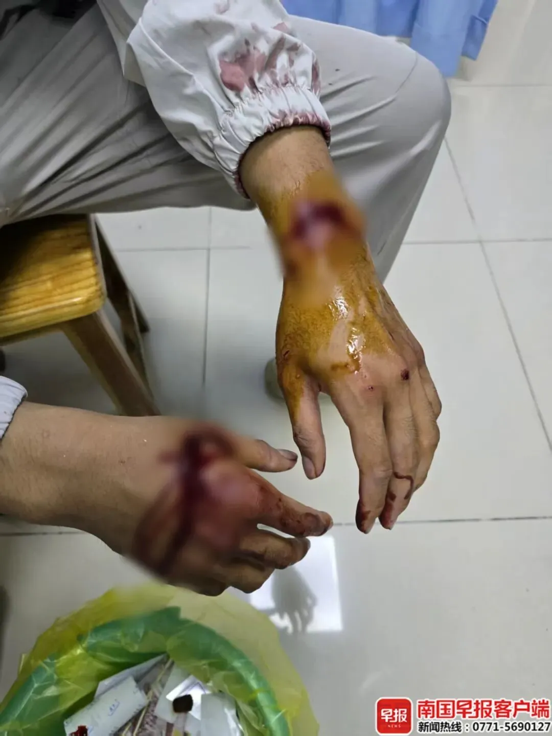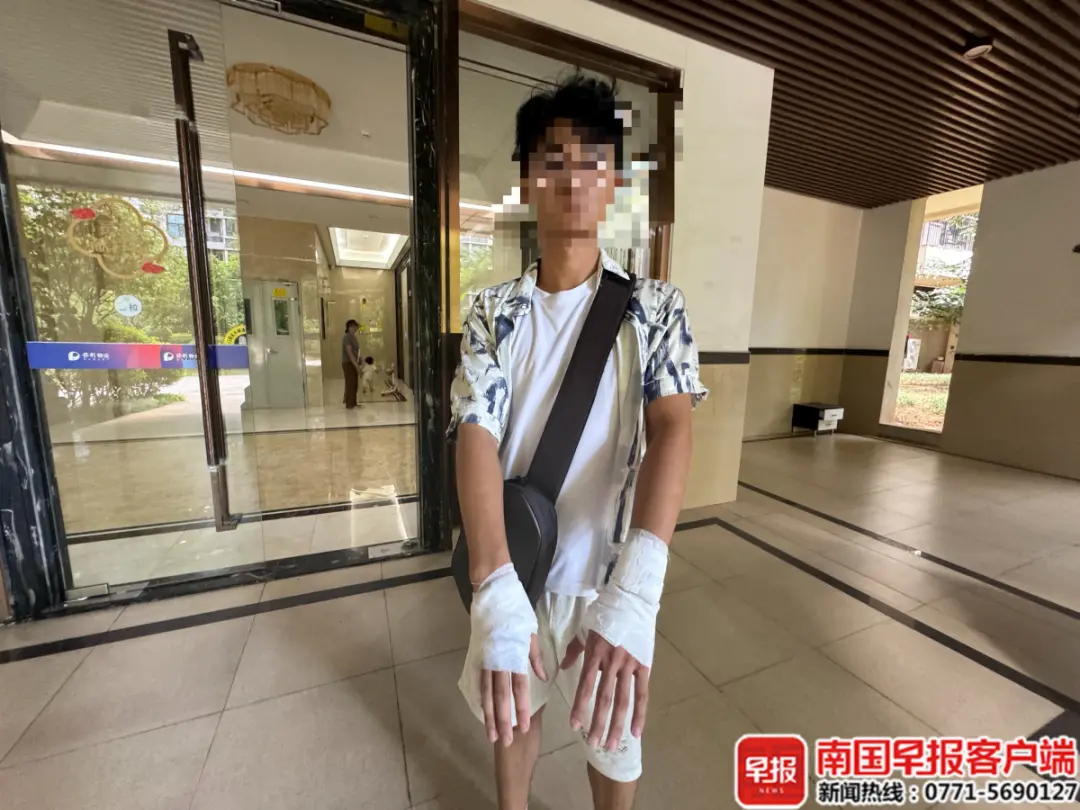 近日,钟先生反映,他在南宁市保利领秀前城领秀府小区被爆裂的玻璃门割伤双手,共缝了30多针。钟先生认为小区物管应该赔偿,截至目前赔偿尚未有实质性进展。