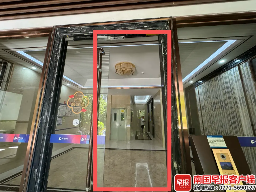 9月13日上午,南国早报全媒体记者在该小区3栋1单元大门看到,事发现场已清理完毕。原本并排的两扇玻璃门,此时只剩下一扇。缺失的玻璃门高约2.5米,宽约0.7米。