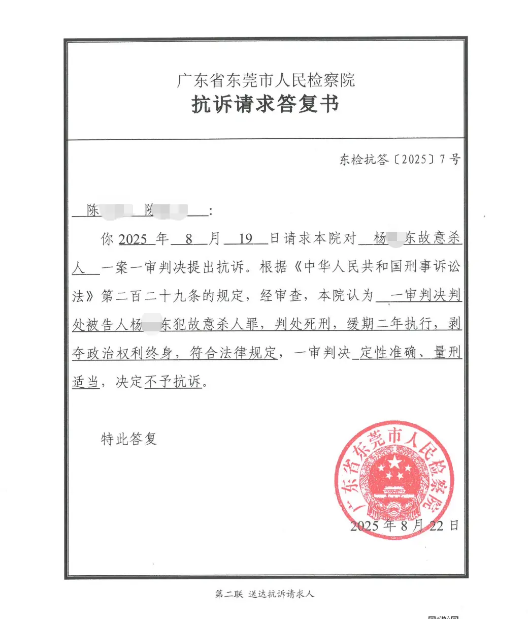 8月18日,被害人家属向东莞市检察院申请抗诉,未获支持。随后,他们提起刑事附带民事上诉,除原判的7万余元外,还要求赔偿死亡赔偿金和被扶养人生活费,共计164.3万元,并将向广东省检察院申请刑事抗诉,诉求是判处杨某东死刑立即执行。