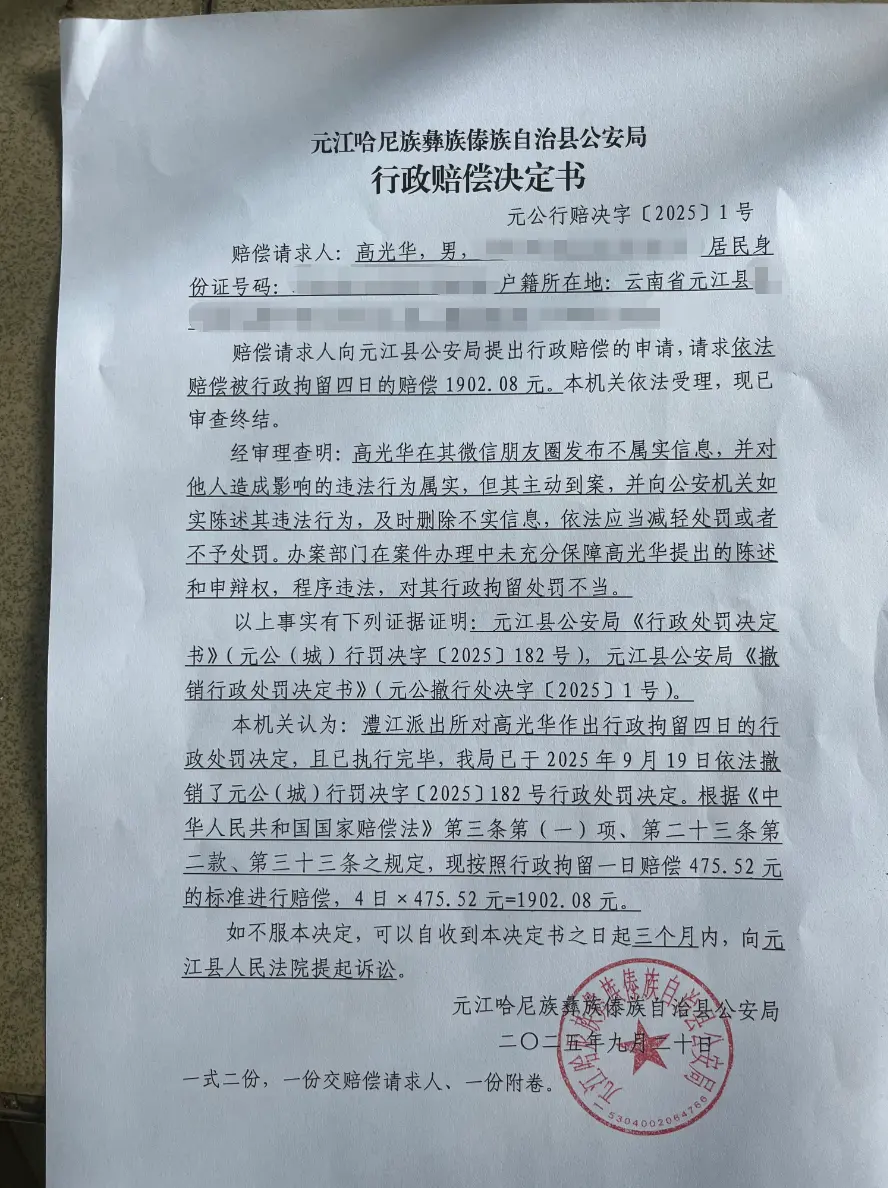 9月20日下午,“发朋友圈评论县教体局长免职被拘4天”一案当事人高光华告诉澎湃新闻,云南元江县公安局已撤销此前对其作出的行政处罚决定,并依据《中华人民共和国国家赔偿法》的相关规定,向其支付了1902.08元国家赔偿金。