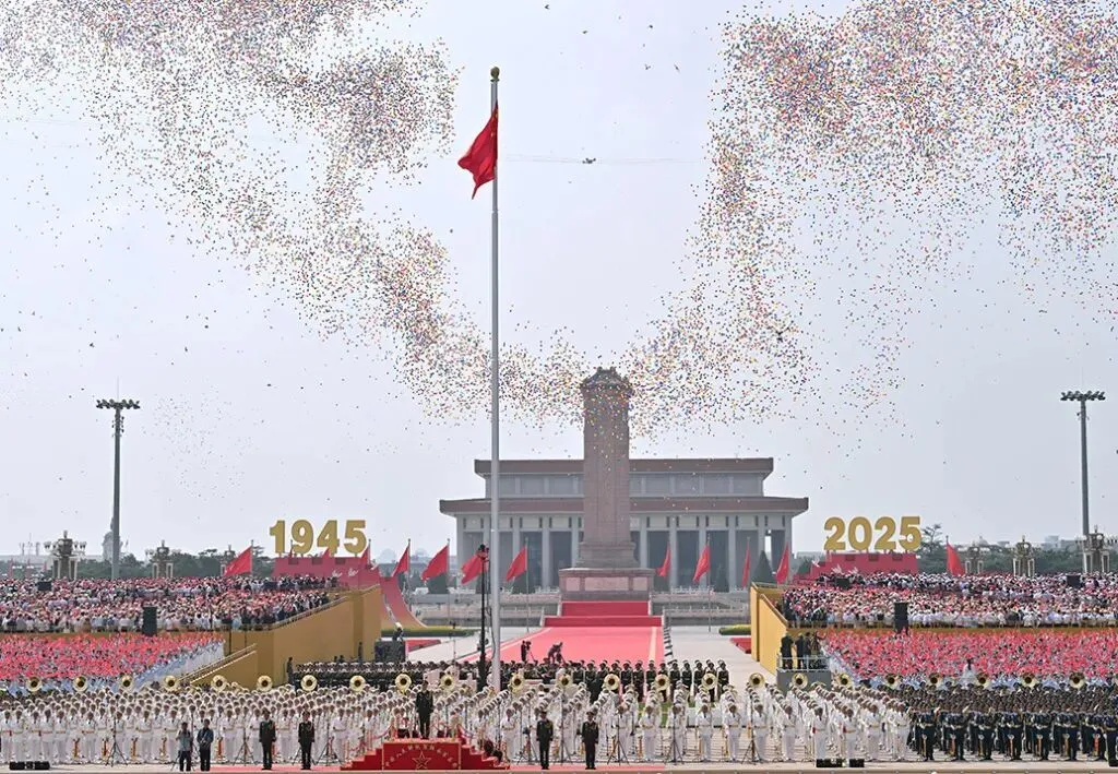 2025年9月3日,纪念中国人民抗日战争暨世界反法西斯战争胜利80周年大会在北京隆重举行。这是纪念大会现场放飞气球。 新华社 图