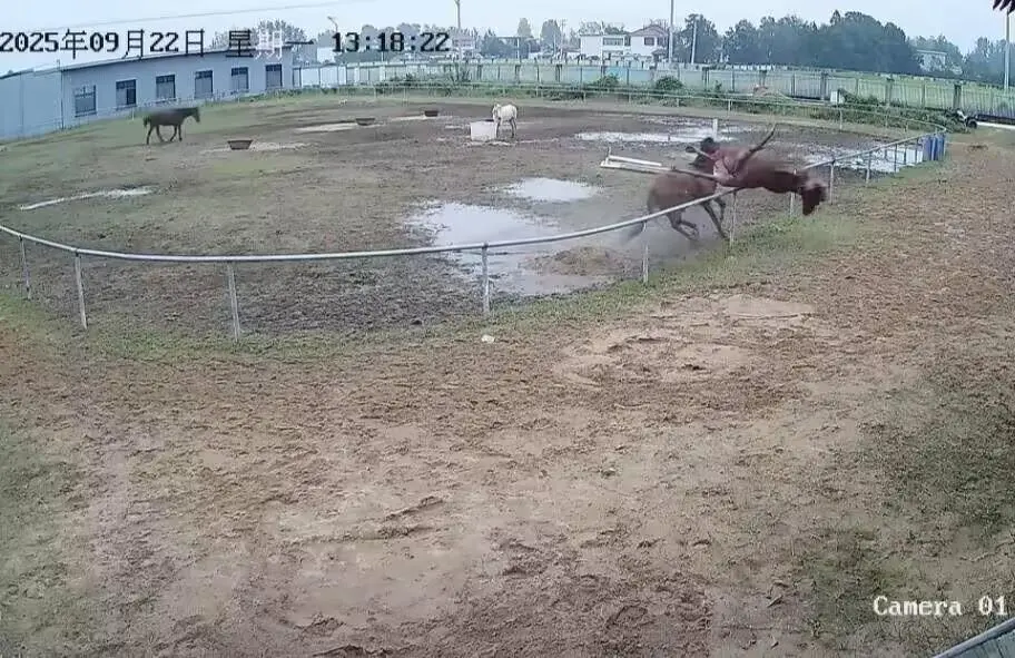 俱乐部监控显示,两匹马正在护栏围起来的草地上追逐,一匹马试图跳过护栏,但腿被护栏绊了一下,摔倒在护栏外。马儿挣扎了一下,随后不动了。