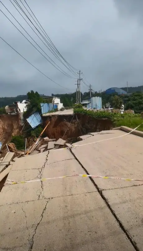 视频显示,一条水泥硬化路面出现断裂坍塌,现场地面上还留有警戒带,附近不远处疑似是一处矿坑。