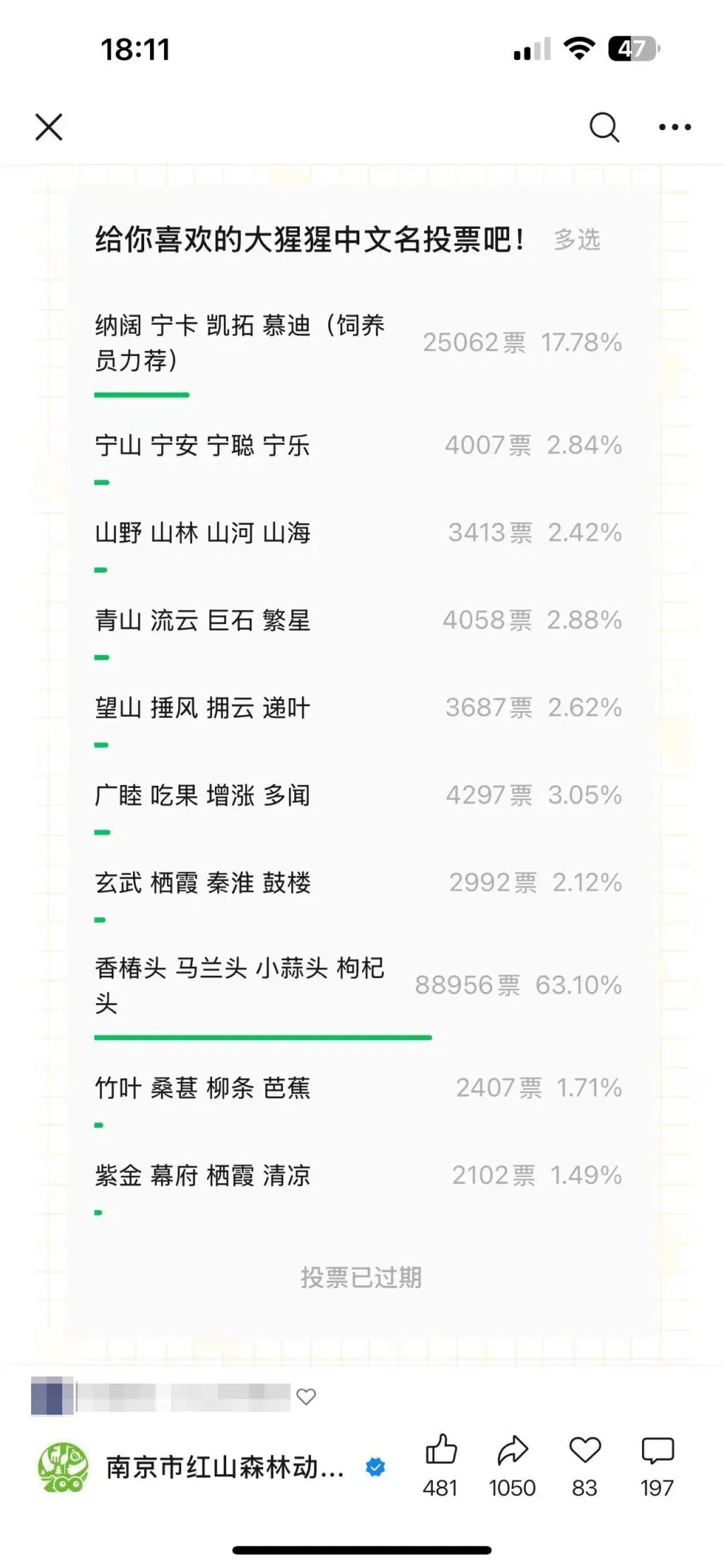此前,在红山动物园发起的征名“十选一”网络投票中,“野菜组合”的得票率达到63%,断崖式领先第二位的“饲养员推荐名”。该园宣教部工作人员告诉澎湃新闻:我们尊重投票结果,选出谁就用谁。