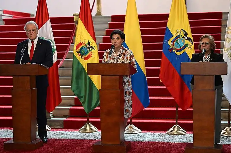 当地时间2025年9月30日,哥伦比亚波哥大,哥伦比亚外交部长罗莎·约兰达·比利亚维森西奥(右)、厄瓜多尔外交部长玛丽亚·索默菲尔德(中)和秘鲁驻哥伦比亚大使、安第斯共同体秘书长贡萨洛·古铁雷斯出席安第斯共同体轮值主席国交接仪式。 视觉中国