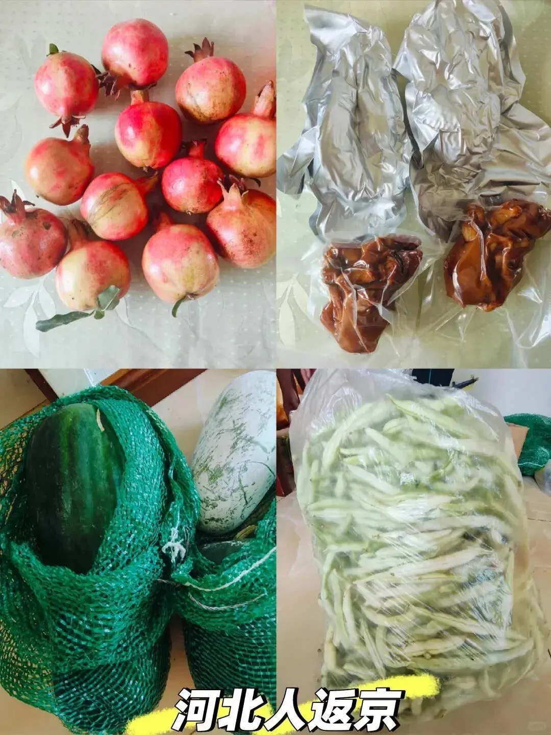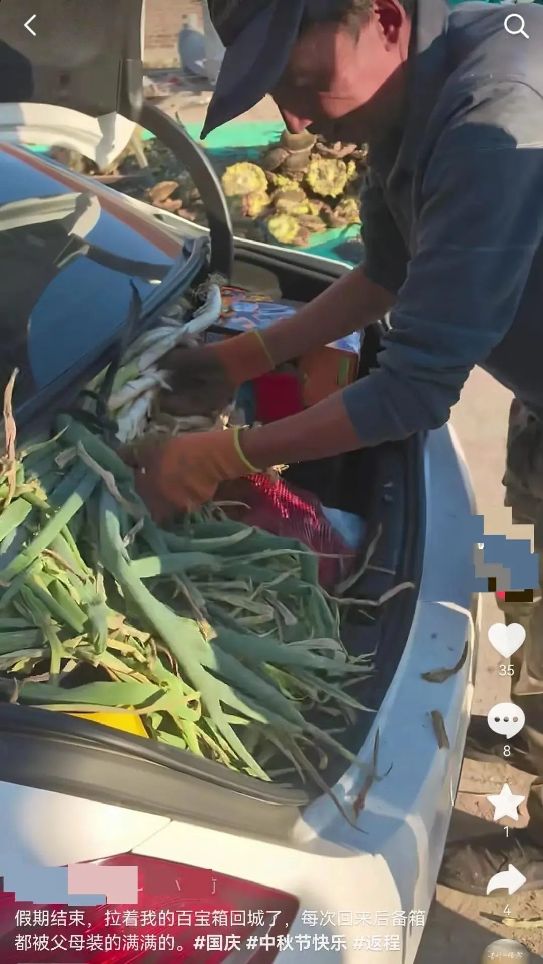 小红书博主“糖豆哥哥成长记”也发文说:10月7日国庆返京啦,担心最后一天会被堵在路上。每次假期返京,后备厢都会被爸爸妈妈和妹妹塞得满满的。高考结束后离开小县城,也离开了父母的呵护。如今已在北京落户安家多年,可每次假期结束回北京,后备厢从没空过!这次又被爸妈和妹妹塞得满满当当:自家种的红薯、新鲜扁豆、豆角、冬瓜。豆角和冬瓜太多了,爸妈还嘱咐让我们给邻居分点。自制的卤烧鸡和猪蹄,还有妈妈在院子里种的石榴……爸爸特意买了我们老家的特产片粉、香肠、炸兰花豆……