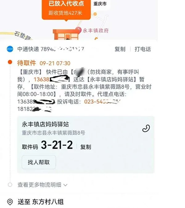 重庆忠县市民袁先生近日向澎湃公众互动平台“服务湃”反映称,今年9月,他给家里老人网购了一批鲜活树苗,卖家通过中通快递发货。9月21日上午,袁先生查看物流信息发现快递已送达代收点,遂通知父亲去取。袁先生的父亲花了一个小时走路从村里赶到镇上的代收点,被告知快递下午才到。第二天上午,袁先生的父亲又走路到镇上的代收点才取回快递。