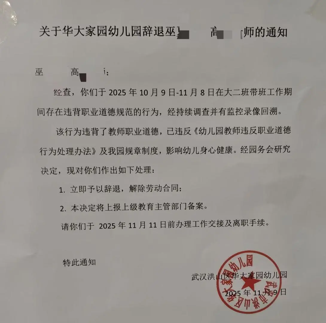 李先生提供给记者的一份华大家园幼儿园11月9日发出的《通知》称:“巫某某、高某老师:经查,你们于2025年10月9日-11月8日在大二班带班工作期间存在违背职业道德规范的行为,经持续调查并有监控录像回溯。该行为违背了教师职业道德,已违反《幼儿园教师违反职业道德行为处理办法》及我园规章制度,影响幼儿身心健康。经园务会研究决定,现对你们作出如下处理:立即予以辞退,解除劳动合同;本决定将上报上级教育主管部门备案。”