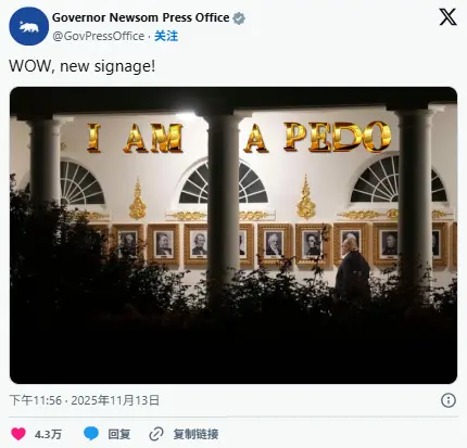 纽森的新闻办公室抓住这一消息,在X网站上发布了一张照片,照片中对特朗普白宫西翼柱廊的翻新进行了恶搞。特朗普那俗艳的“总统星光大道”标牌不见了,取而代之的是“我是恋童癖”的字样。