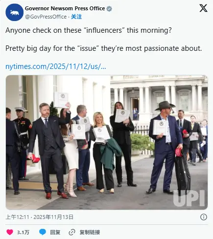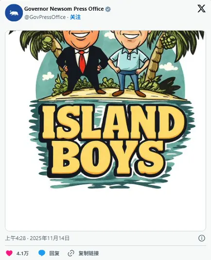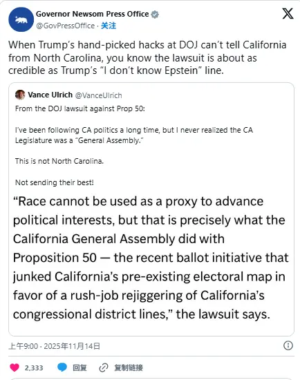 在第三篇帖子中,纽森抨击了特朗普关于他并不认识爱泼斯坦的说法,同时驳斥了司法部针对加州第50号提案(加州选民在11月4日投票通过的选区重划方案)提起的诉讼。
