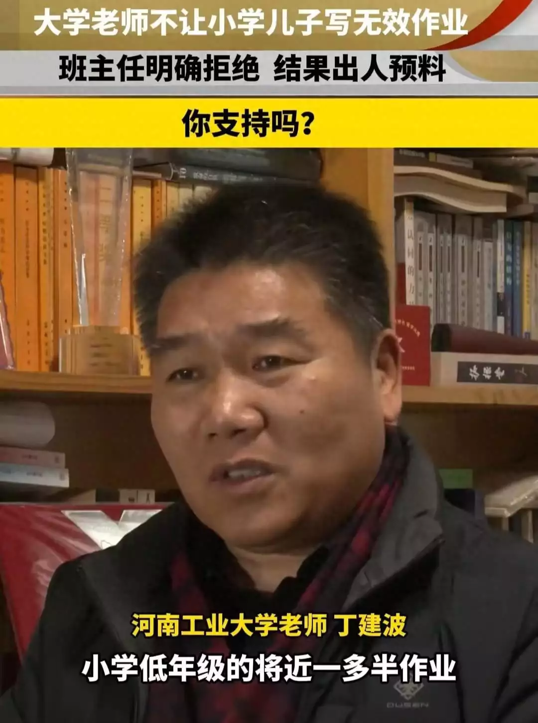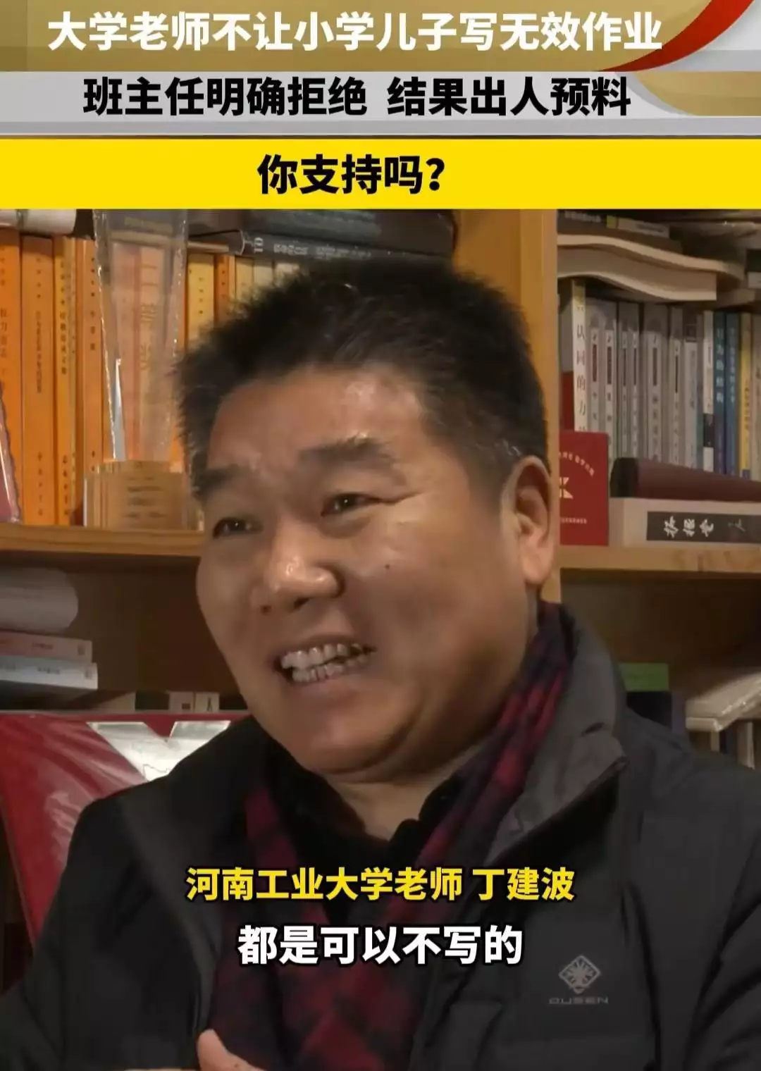 于是,这位大学老师就跟小学儿子的老师商量,不想让自己的儿子写无效作业,但班主任很强硬地回复,那肯定不行。丁建波并未妥协,坚持让自己的孩子试一试,让作业量减下来。