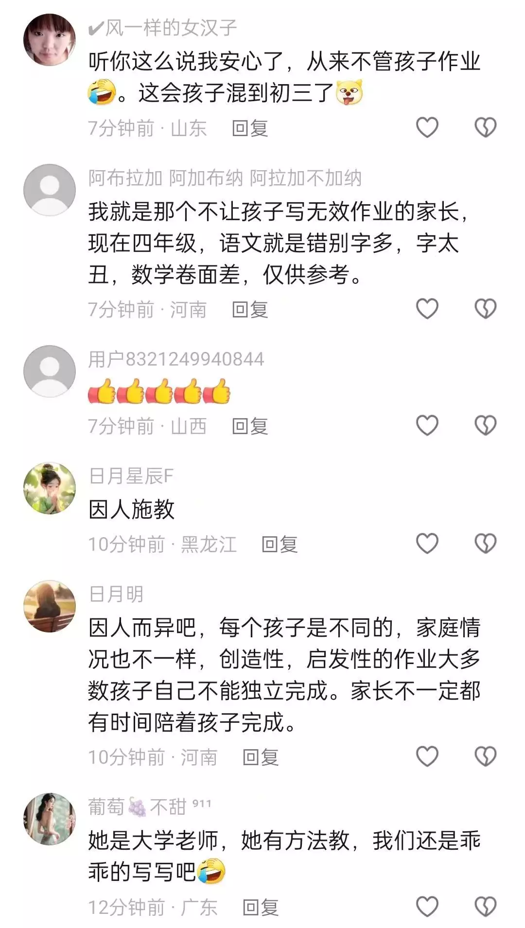 还有家长现身说法,称自己就是那个不让孩子写无效作业的家长,现在孩子读四年级,语文就是错别字多,字丑,数学卷面也差。