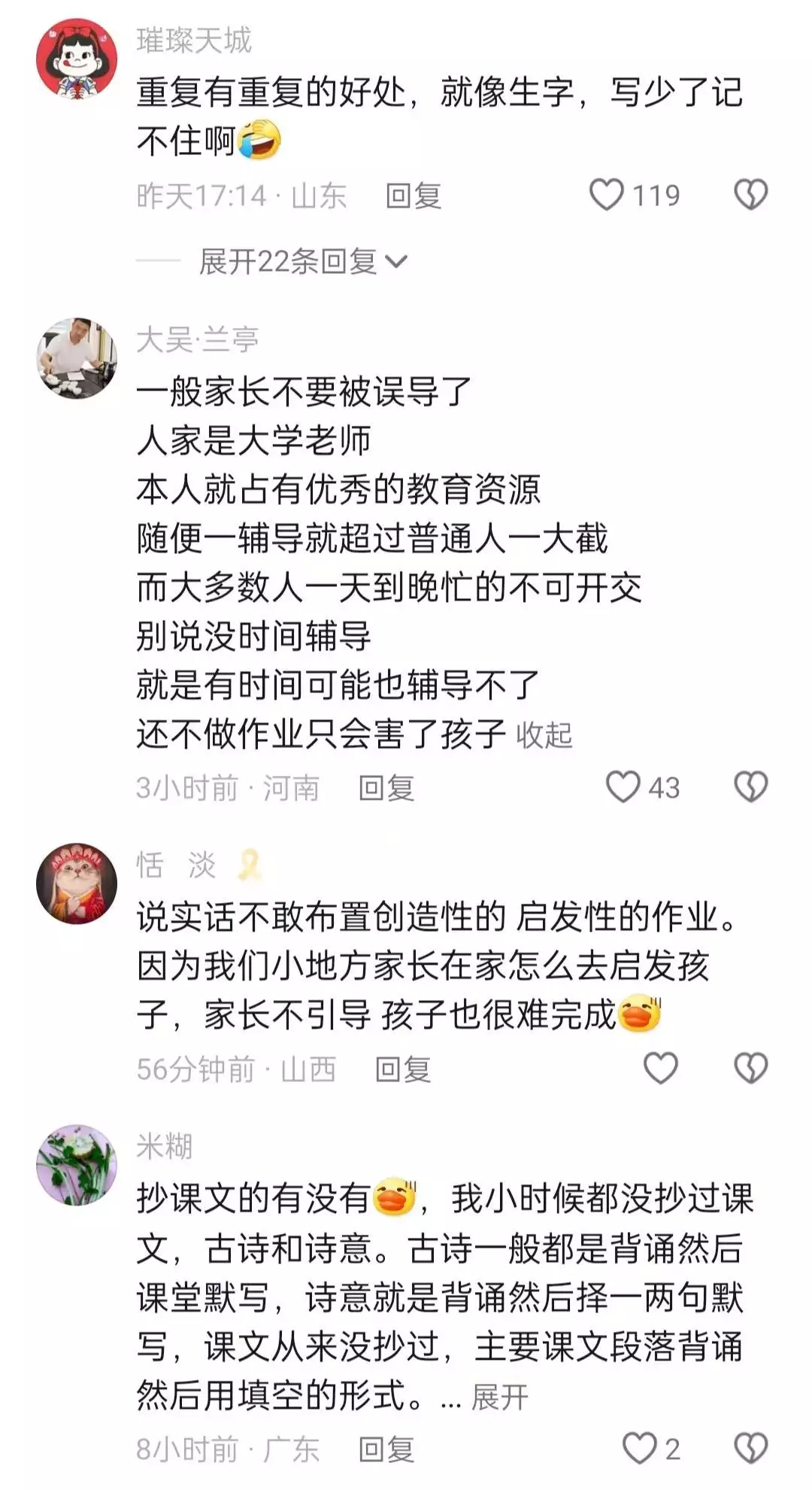有人就说,重复有重复的好处,就像生字,写少了记不住;也有人提醒,一般的家长不要被误导了,人家是大学老师,占有优秀的教育资源,随便辅导一下就超过普通人一大截......