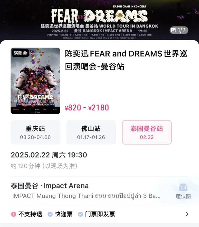 原定2025年2月22日在泰国曼谷IMPACTARENA举办的《陈奕迅 FEARand DREAMS 世界巡回演唱会 曼谷站》将取消举行。