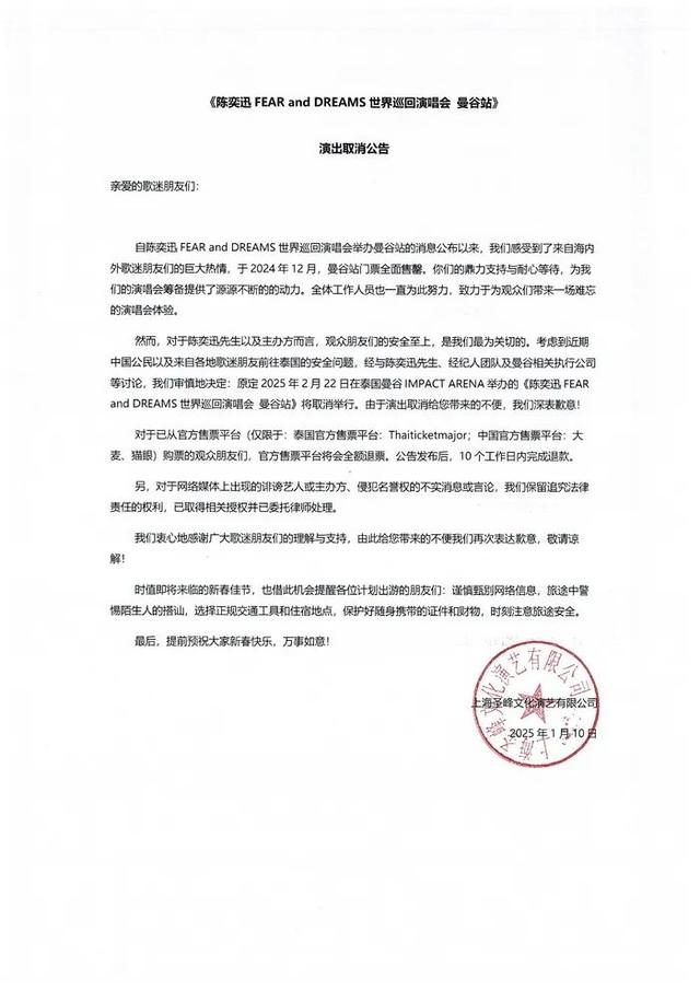 1月10日下午,@圣峰演艺 发布《陈奕迅 FEAR and DREAMS 世界巡回演唱会 曼谷站》演出取消公告。