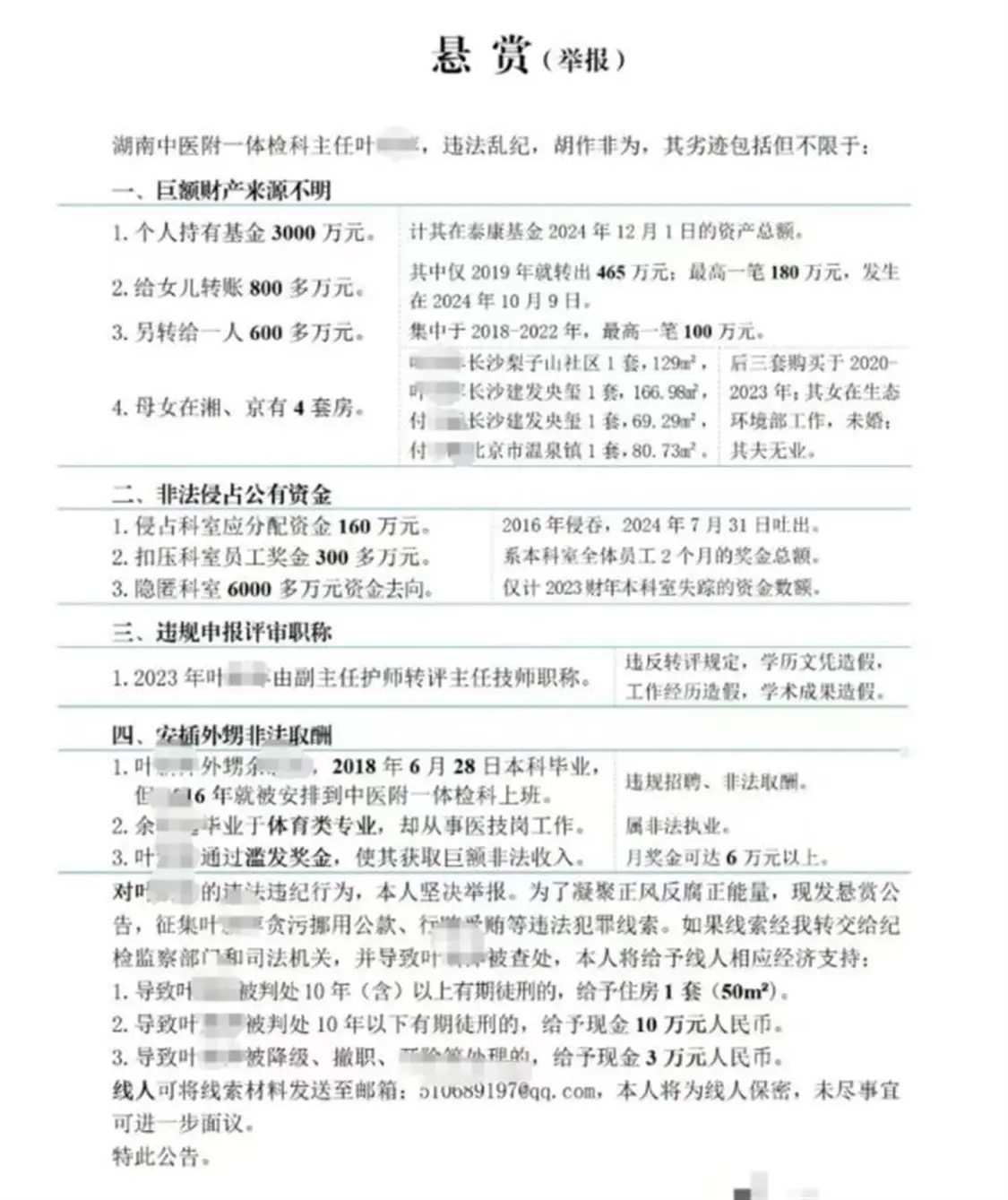 4月初,网友@像雾像云又像风举报湖南中医药大学第一附属医院健康管理科主任叶某巨额财产来源不明、非法侵占公有资金等,引发关注。举报信息显示,该网友公开征集叶某贪污挪用公款、行贿受贿等违法犯罪线索,并称愿意给予线人相应的经济支持,金额从3万至10万元不等,最高赠予1套50平方米的住房。(据4月10日大风新闻报道)