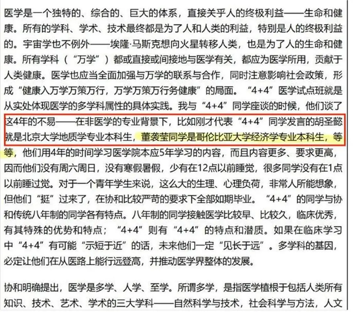 2023年7月,中国医学科学院新闻中心微信公众号发布了一篇《植根多学科的沃土长成医学的参天大树——王辰校长寄语协和医学院2023届毕业生》的文章,提到:“我与‘4+4’同学座谈的时候,他们谈了这4年的不易——在非医学的专业背景下,比如刚才代表‘4+4’同学发言的胡某某就是北京大学地质学专业本科生,董某莹同学是哥伦比亚大学经济学专业本科生等等”。2025年4月25日,该微信公众号对文章进行了修改,少了“董某莹同学是哥伦比亚大学经济学专业本科生”这句话。有其他网络平台此前也转载了这篇文章,并于近日进行了修改。