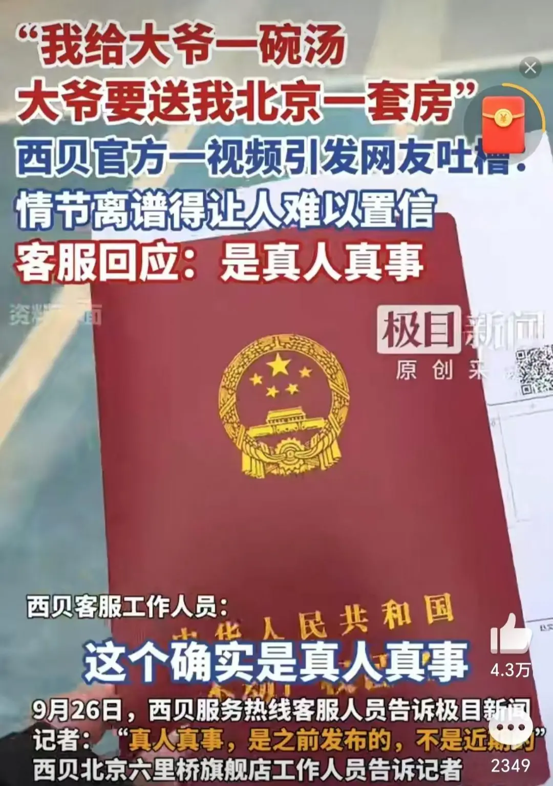 与大V罗永浩发生口水战后,知名餐饮品牌西贝的一举一动被网友用放大镜观察。近日,有网友扒出一则西贝官方发布的视频《我给大爷一碗汤,大爷要送我北京一套房》,引发许多人吐槽。