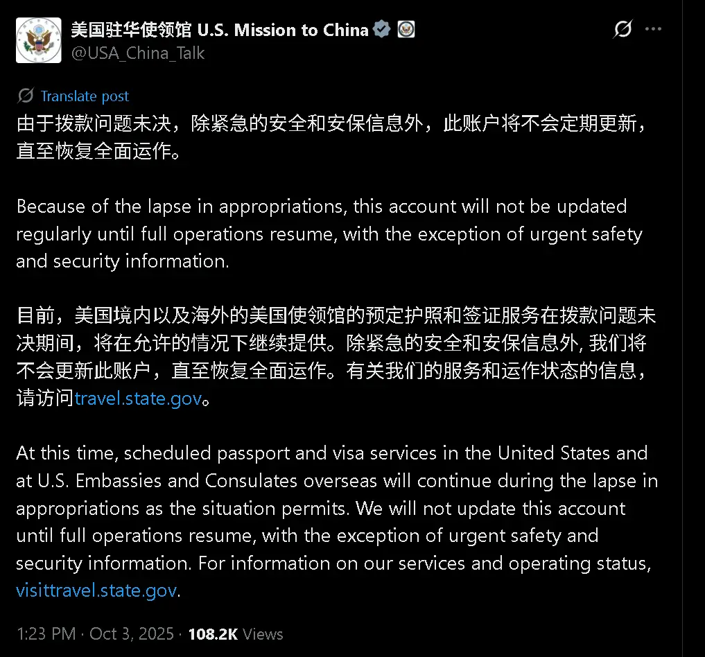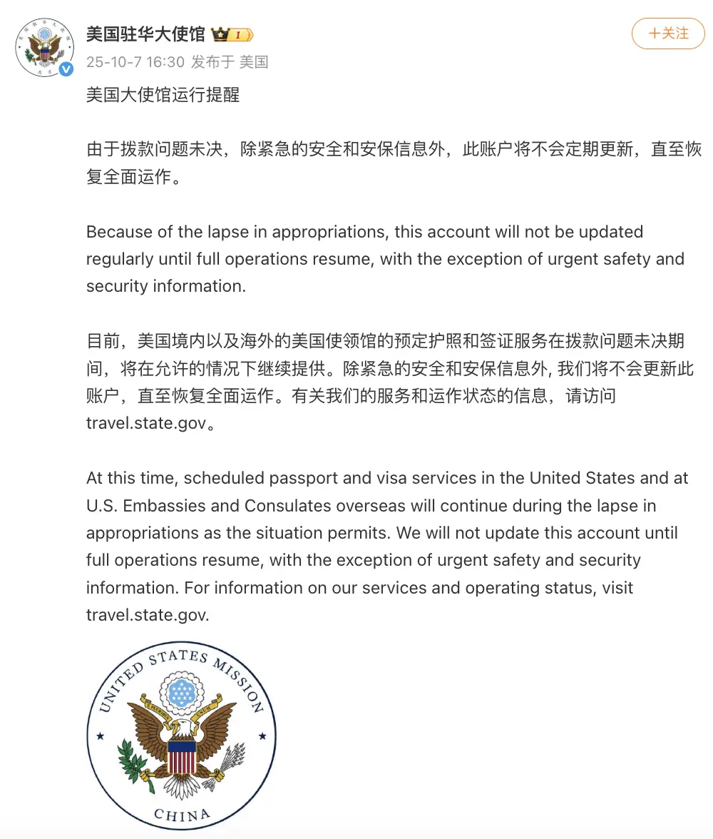 据环球时报此前报道,北京时间10月3日下午1时23分,美国驻华使领馆在美国社交平台X上的官方账号上宣布,由于拨款问题未解决,除紧急的安全和安保信息外,此账户将不会定期更新,直至恢复全面运作。