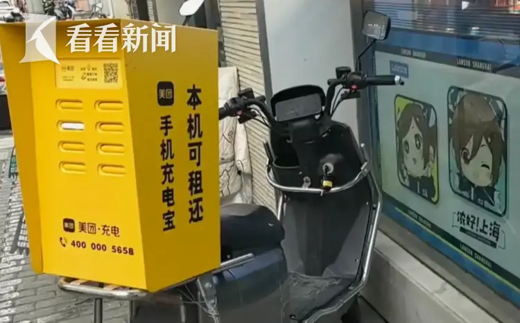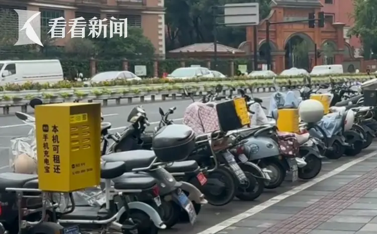 这种加装在非机动车上的共享充电宝租赁设备,悄然出现在了很多人流密集区域。像武康大楼所在的这个路口,就有四辆,不远的地铁出站口外,我们也发现了两台共享充电宝“专车”,且柜机基本来自同一品牌。