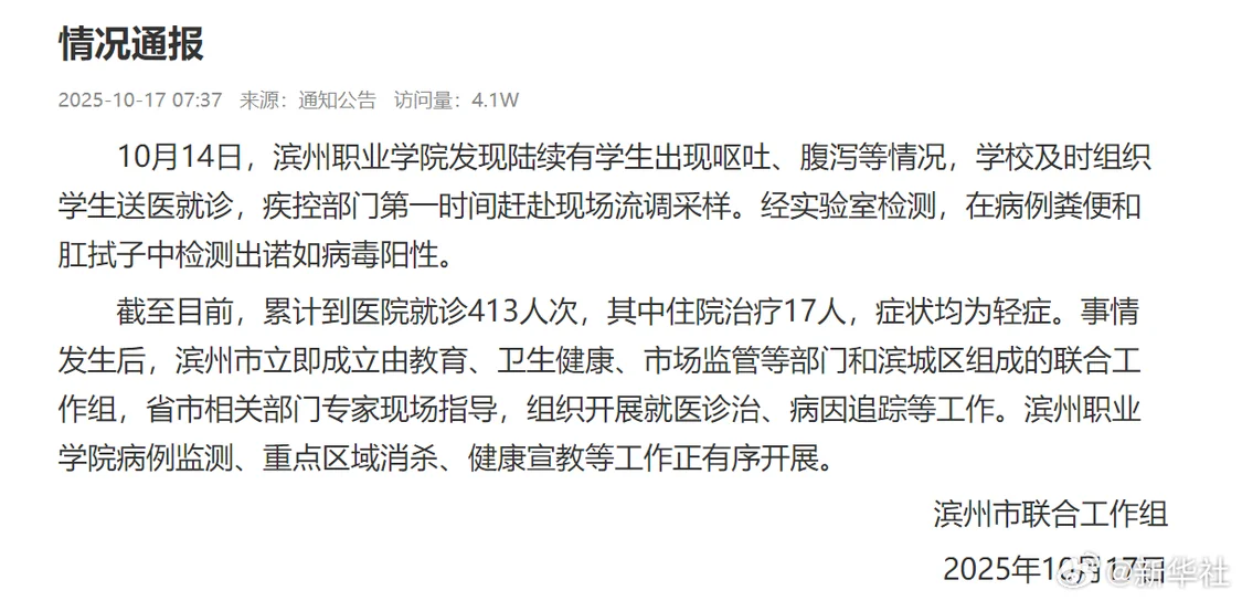 截至目前,累计到医院就诊413人次,其中住院治疗17人,症状均为轻症。事情发生后,滨州市立即成立由教育、卫生健康、市场监管等部门和滨城区组成的联合工作组,省市相关部门专家现场指导,组织开展就医诊治、病因追踪等工作。滨州职业学院病例监测、重点区域消杀、健康宣教等工作正有序开展。