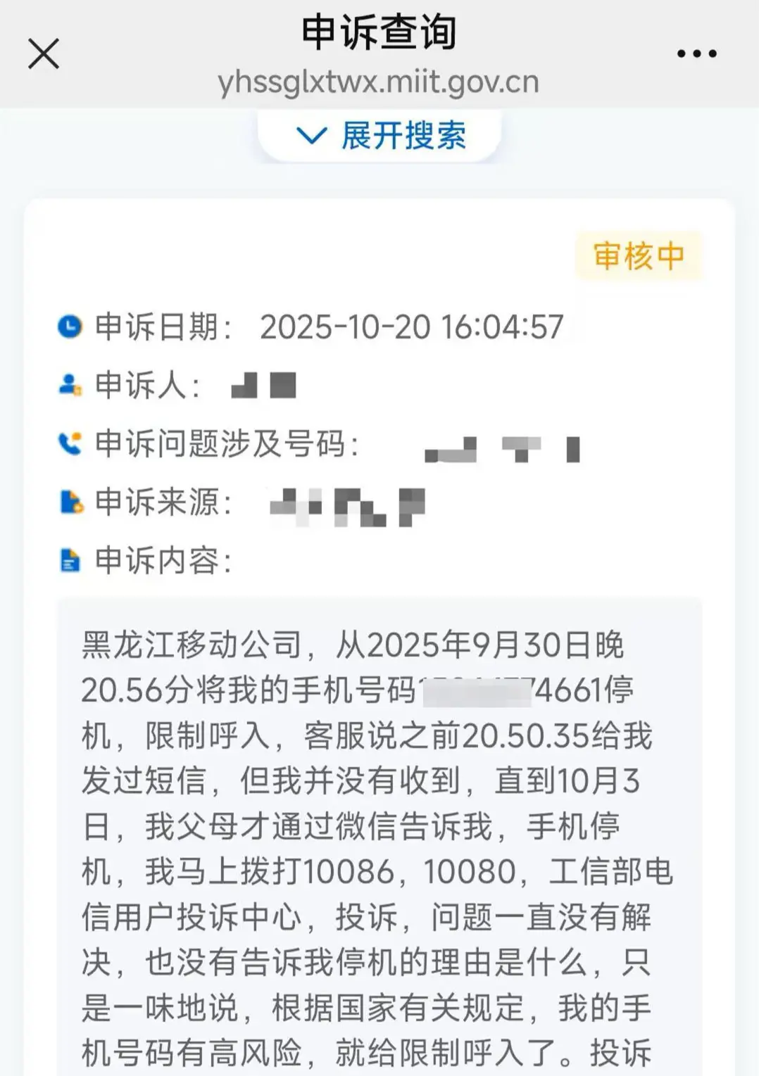 为尽快解除手机的呼入限制,杨先生在今年国庆期间按照客服提示,自行在家尝试恢复手机接打电话功能,但并未办理成功。无奈之下,杨先生国庆假期前往哈尔滨道里区新阳路移动营业厅办理解封业务,但他表示营业厅当天因网络故障也未解封成功。直到10月17日他再次与移动客服电话沟通,完成线上身份验证后,手机才最终恢复正常使用。