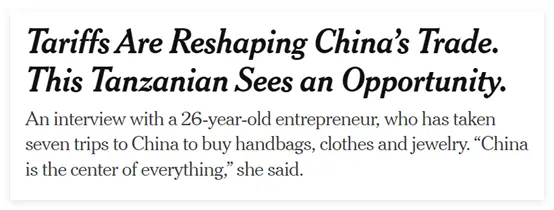 而在艾莎看来,这位非洲女商人的经历还说明,尽管美国政府想通过关税等手段威胁中国,“但中国非但没有放缓脚步,反而卖出了比以往任何时候都多的商品,而这一次,买家是世界其他地区。”