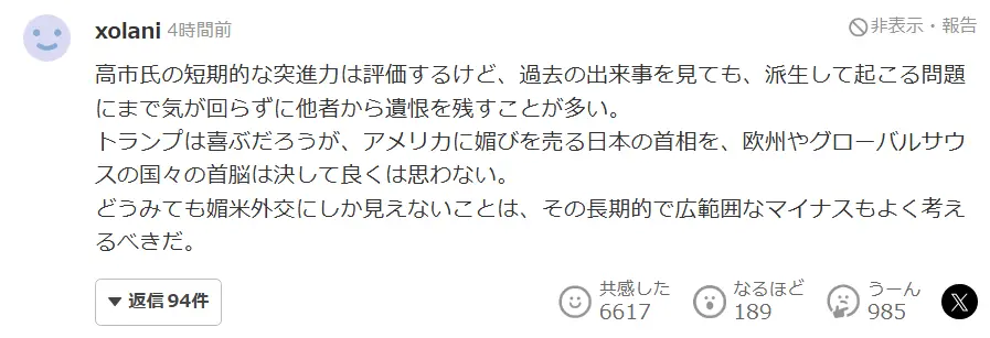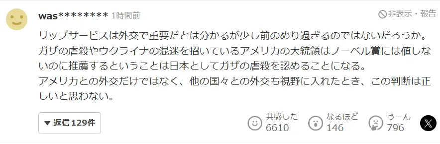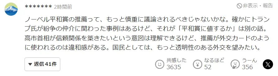 也有网民对高市早苗总体上表示理解,但也反对推荐特朗普参评诺贝尔奖:“我理解高市首相希望建立信任,但我对这种将推荐用作外交手段的做法感到不安。”