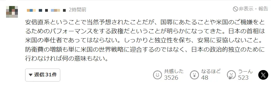 有网友的评论则近乎是“直球开骂”:“不愧是安倍嫡系,这届政府明显是在羞辱国家,并为了讨好美国而作秀。日本首相不应该成为美国的奴仆。他必须保持独立,不能轻易妥协。除非是为了日本的政治独立,而不是为了迎合美国的全球战略,否则增加国防开支将毫无意义。”