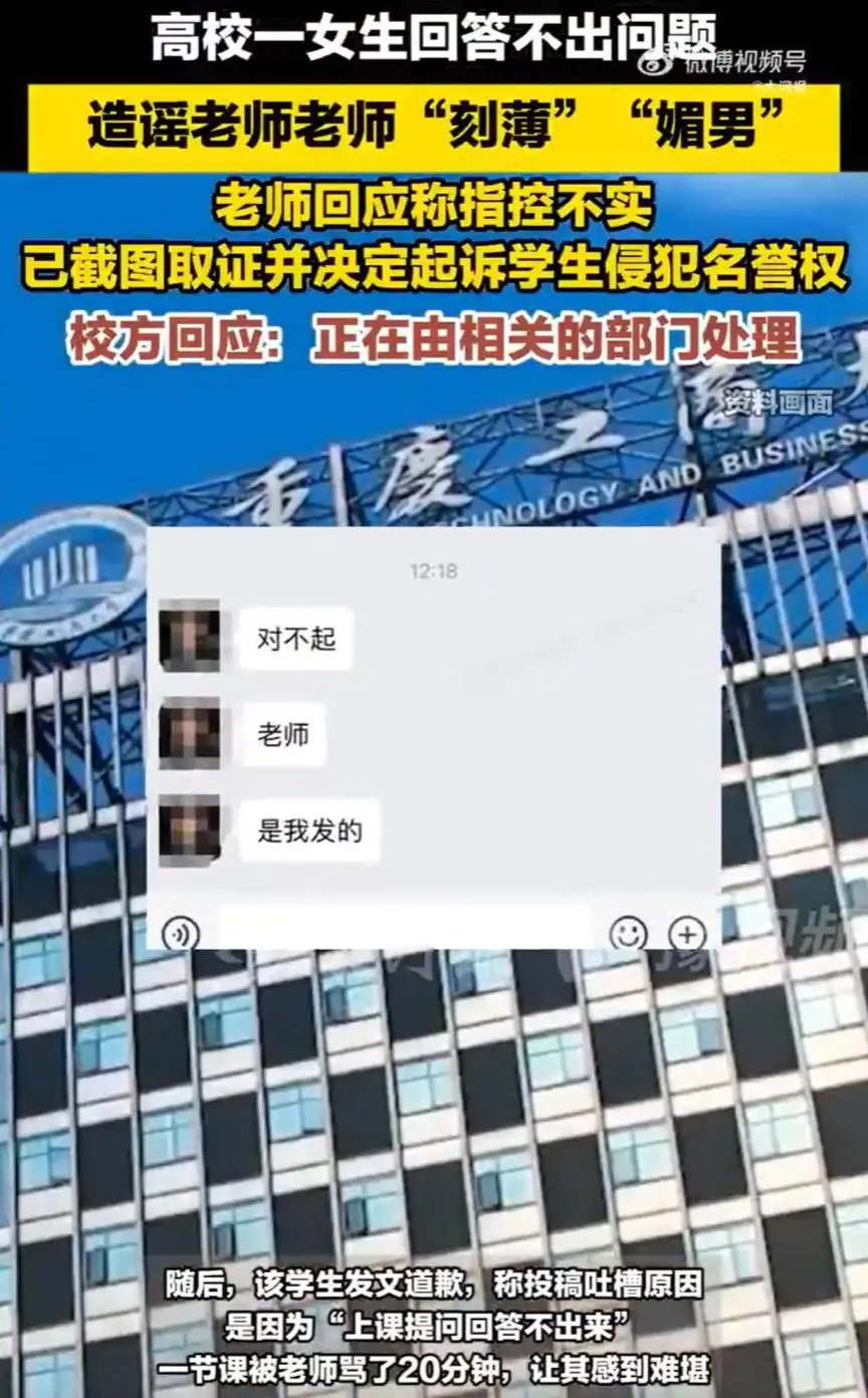 该老师发现后,将投诉内容截图发到学生群内,要求投诉者拿出证据,并表示已联系发布平台获取投诉者信息,将起诉其侵犯名誉权。随后,投诉者发文道歉,称很抱歉在气头上做了这件事,自己不是主观走神,而且患有ADHD(注意力缺陷障碍)。涉事老师表示不接受道歉,强调会让学生承担法律责任。10月30日,重庆工商大学辅导员对此作出回应:事情正在由相关的部门处理,具体情况不方便说。