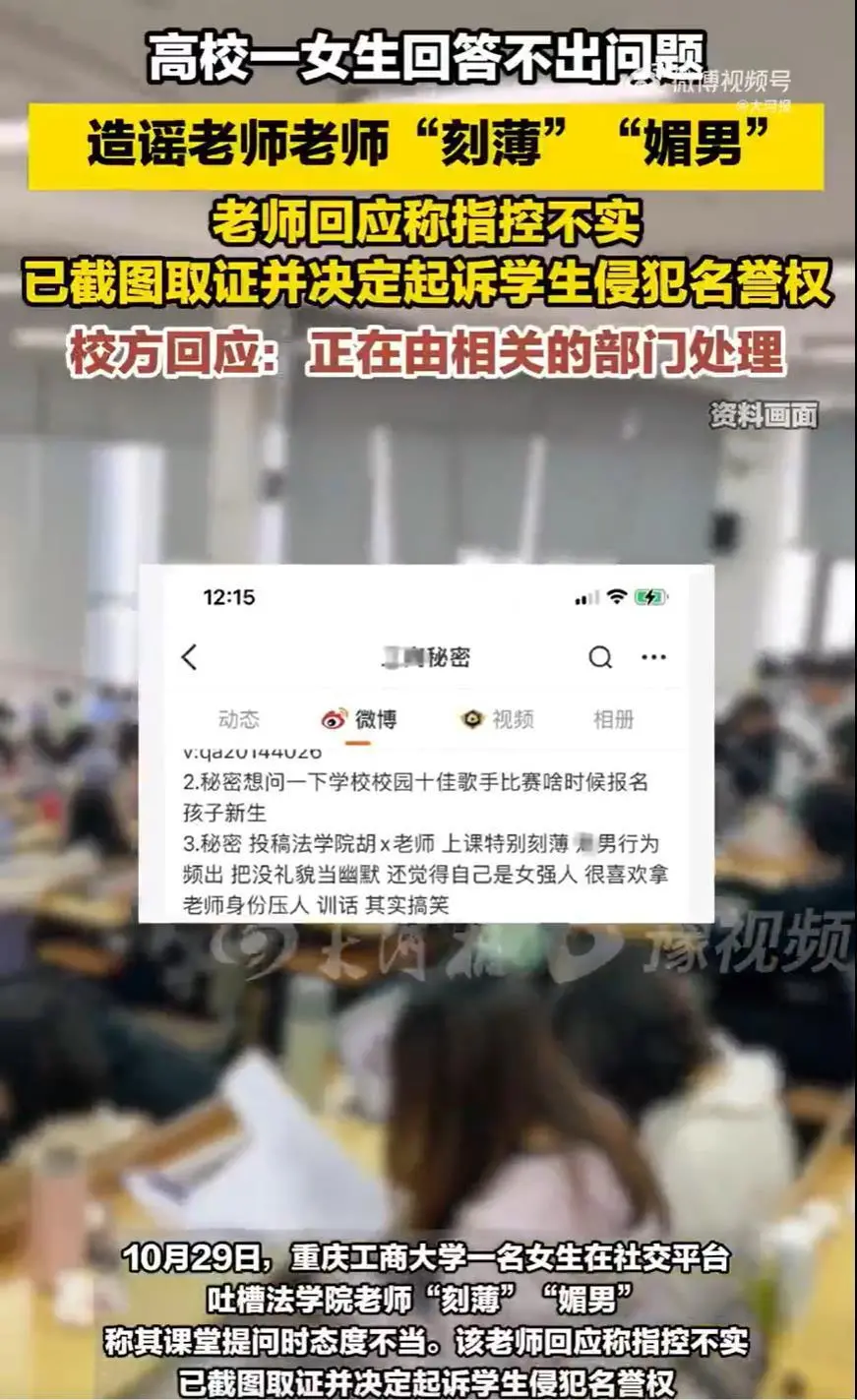 近日,重庆工商大学一名女生在社交平台公开投诉某老师刻薄、媚男,称法学院胡X老师“上课特别刻薄、把没礼貌当幽默”。这条匿名投稿在微信群聊中迅速传播,引发关注。