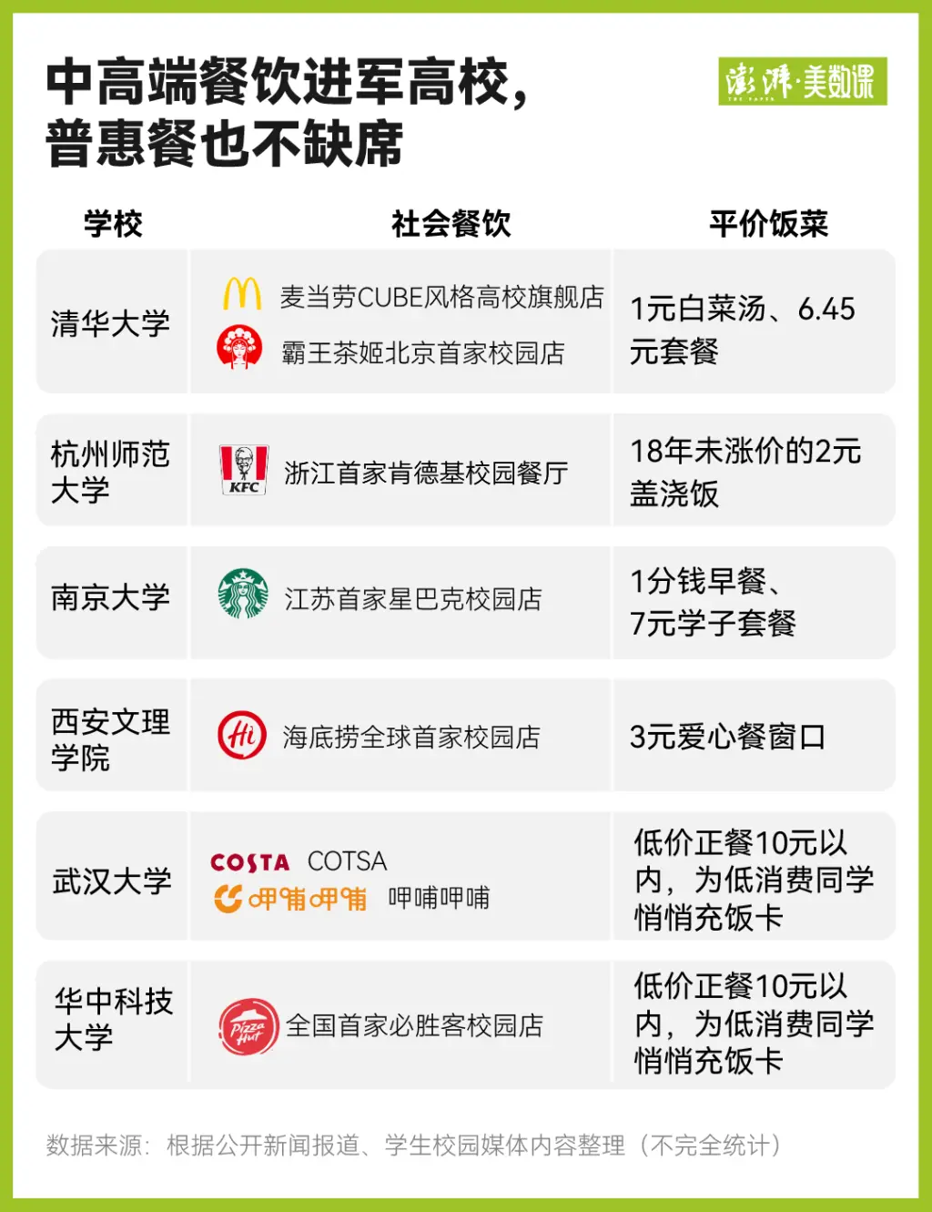 事实上,虽然高校餐饮积极拥抱市场,但作为硬性的国家规定,普惠性的服务在大学食堂从未缺席。根据公开报道,梳理引入中高端餐饮的部分学校可以发现,它们也都提供普惠、平价的餐食,或者对困难学生给予餐饮补贴。