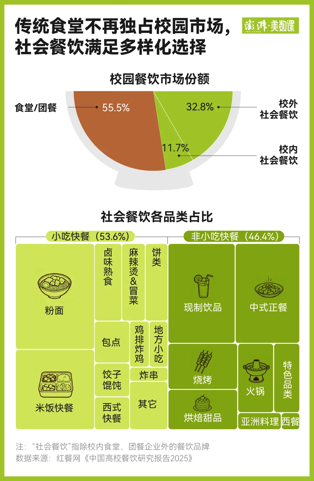 激烈的竞争带来了多样的业态。根据红餐网《中国高校餐饮研究报告2025》,高校社会餐饮中,符合学生消费习惯的小吃快餐和现制饮品占大多数,但烧烤、烘焙甜品、火锅也应有尽有;小吃快餐的细分门类中,粉面、米饭快餐和卤味熟食占比最多。有调侃称:走进高校食堂,仿佛误入商场B1层。