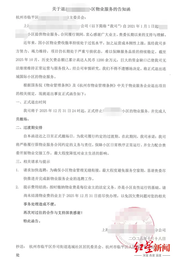 近日,一则由物业公司发出的《退出告知函》引发热议。该函件中,物业称,因小区物业费收缴率持续处于过低水平,加之运营成本刚性上涨,项目长期处于严重亏损状态,难以保障服务品质的持续稳定。截至今年10月,该小区的物业费历史欠费总额累计高达1200余万元。最终,经公司审慎研究决定,于2025年12月31日24时起,正式停止对小区的物业服务,并完成人员撤场。