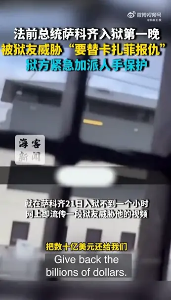 萨科齐资料图。图源:央视新闻 报道称,70岁的萨科齐被关在监狱的单间,隔壁安排了两名治安官。内部人士解释说:“关于前总统的安全,不会有任何风险。” 萨科齐的律师克里斯托弗·安格兰称,萨科齐“什么要求也没提,没有什么优待”。 萨科齐的另一名律师让-米歇尔·达鲁瓦透露,萨科齐的单间有9平方米大小,是桑特监狱的标准关押房间。 安格兰在巴黎桑特监狱大门口说,萨科齐要被关“至少三周或一个月”。对于入狱后获得释放的申请,巴黎上诉法庭有两个月的时间作出裁定。 达鲁瓦在监狱接待室拜访了萨科齐,前第一夫人卡拉·布鲁尼同行。该律师称:“第一天入狱太可怕了,但是他(萨科齐)挺过来了。” 报道称,这是法兰西共和国历史上前所未有的一次关押。巴西总统卢拉和南非总统祖马都曾在下台后入狱,但是欧盟国家的前国家元首还从未发生过这种事。