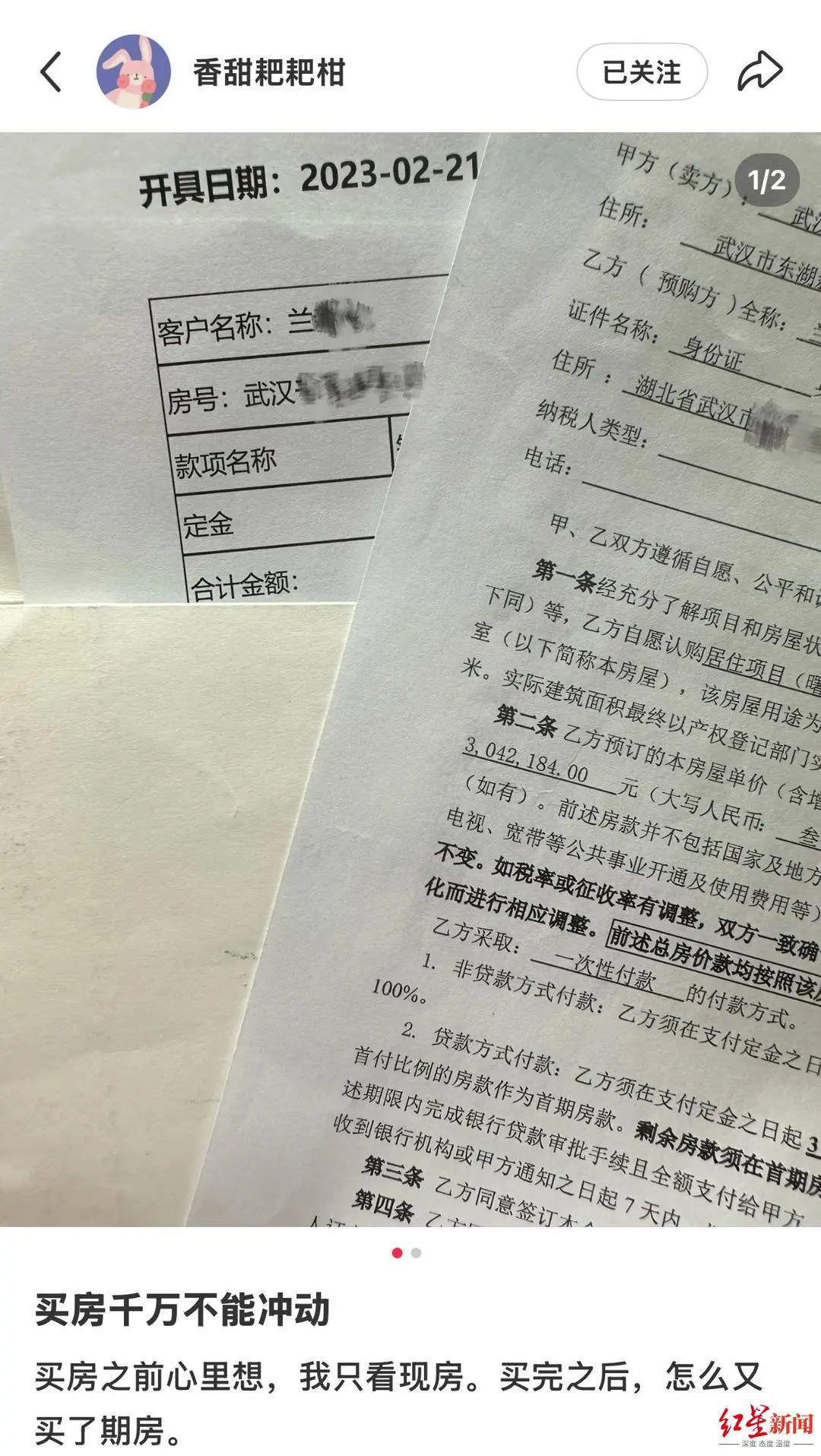 针对陈老板的说法,红星新闻多次尝试联系香甜耙耙柑,但截至发稿并未获得回应。红星新闻记者对比其在个人社交平台发布的多条动态发现,2023年5月31日,@香甜耙耙柑晒出的购房合同信息显示,其所购房产总价确为300万元左右,且房产也的确位于武汉市东湖新技术开发区(即武汉光谷),客户名称处显示该客户姓兰。此外,@香甜耙耙柑分别在2023年3月31日、同年5月28日两次晒出银行大额存单。