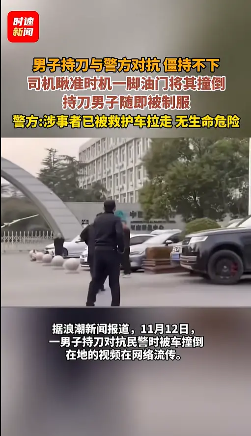 男子持刀与警察对峙,市民开车协助警察将其制服