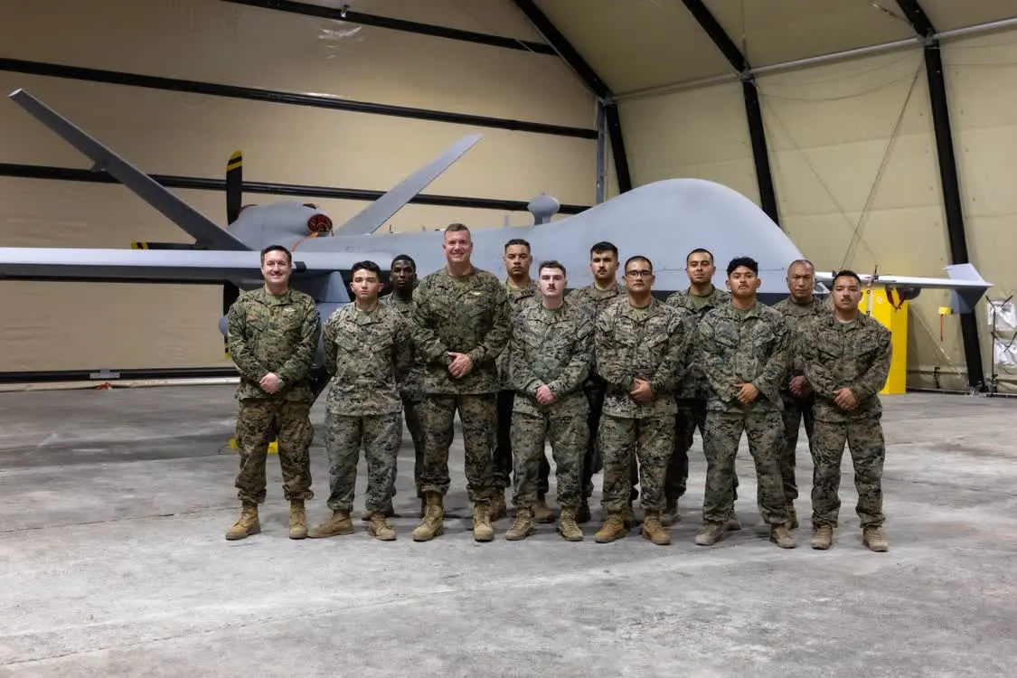 当地时间4月18日,菲律宾巴萨空军基地,美国海军陆战队第3航空联队队员在“死神”无人机前合影。 美国海军陆战队