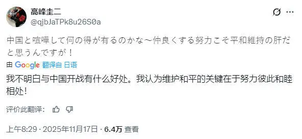 高市早苗的错误言论不仅在中国遭到大量抵制,就连日本各界人士也纷纷表达不满。曾出演日本特摄剧《艾斯奥特曼》人间体“北斗星司”的日本演员高峰圭二,17日在海外社交平台上发文质问高市早苗:“我不明白与中国开战有什么好处。我认为维护和平的关键在于努力彼此和睦相处!”