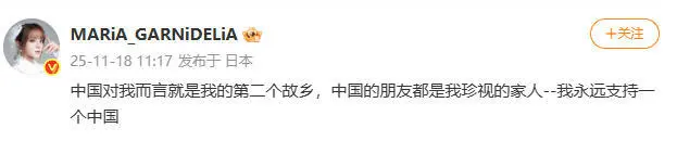 曾在中国参加综艺节目并受到中国网友喜爱的日本歌手美依礼芽,18日在社交网站上发文直言“永远支持一个中国”。她表示:“中国对我而言就是我的第二个故乡,中国的朋友都是我珍视的家人。”