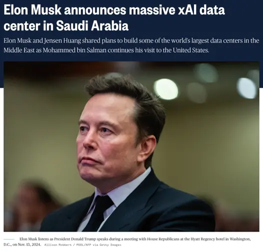 马斯克此时出现在白宫,还有一个绕不开的背景:沙特正在大手笔砸钱建造自己的AI基础设施,而美国几家头部科技公司几乎都参与其中。
