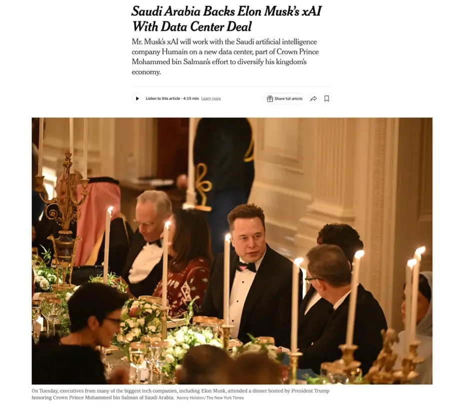 △《纽约时报》报道,马斯克的xAI将与沙特人工智能公司Humain合作建造新的数据中心