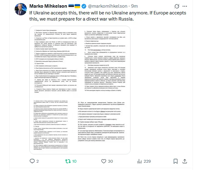 爱沙尼亚议会外委会主席马尔科・米克尔森(Marko Mihkelson)11月21日凌晨在社交媒体晒出了美国的28点和平计划,并评论道:“如果乌克兰接受这份协议,乌克兰将不复存在。如果欧洲接受这份协议,我们就必须做好与俄罗斯直接开战的准备。”